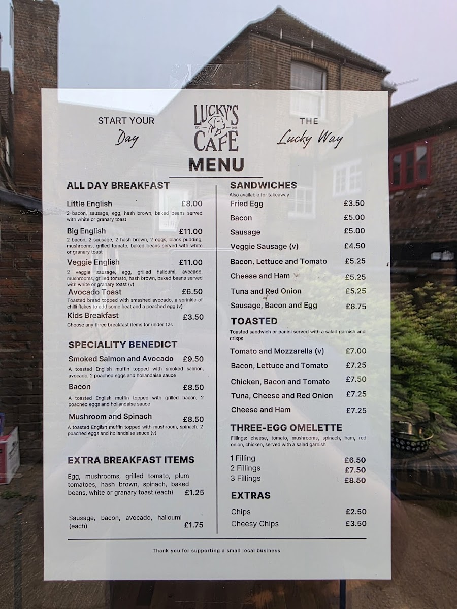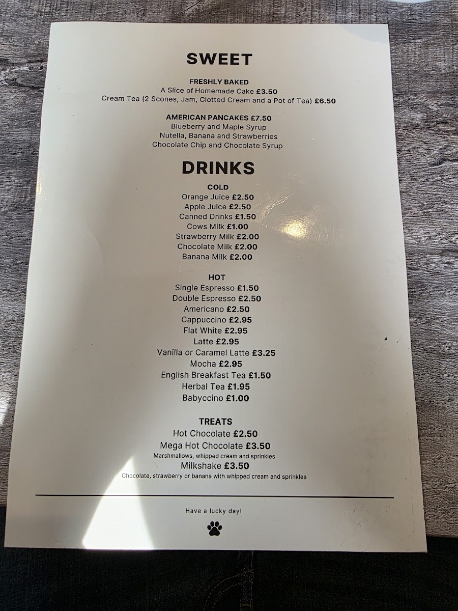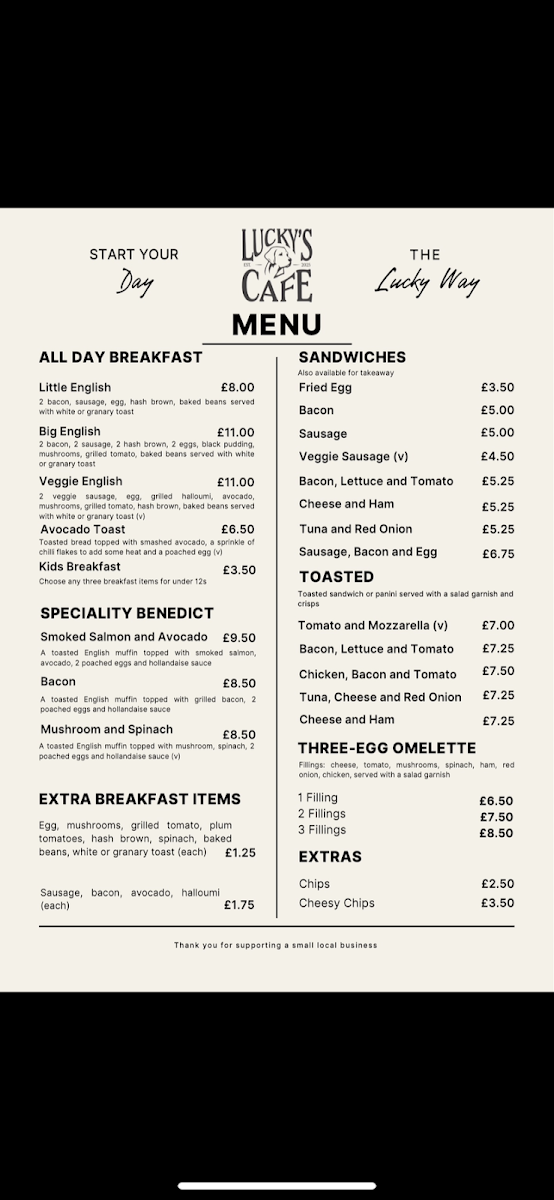 - All Day Breakfast: Includes options such as Little English, Big English, Veggie English, Avocado Toast, and a Kids Breakfast, offering a range of traditional and vegetarian-friendly breakfast items.